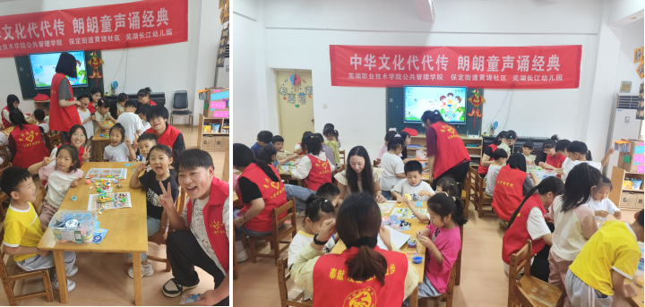 当日上午,志愿队与黄陇村长江幼儿园联合开展“中华文化代代传 郎朗童声诵经典”幼儿爱心公益课堂活动。活动之前,“点亮童心”志愿服务队成立分为国学经典教学组与手工黏土教学组,分别为小朋友们设置不同的教学内容,旨在通过寓教于乐的方式,让小朋友们在快乐中学习到中华文化的博大精深和手工制作的乐趣。
