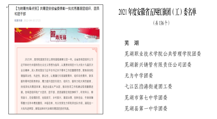 时值“五四”青年节前夕,4月30日,共青团安徽省委员会发布表彰优秀基层团组织、团员和团干部决定。公共管理学院团委通过学校团委推荐,团市委审核和团省委评审,最终荣获团省委授予基层团组织的最高荣誉——“安徽省五四红旗团委”称号。
