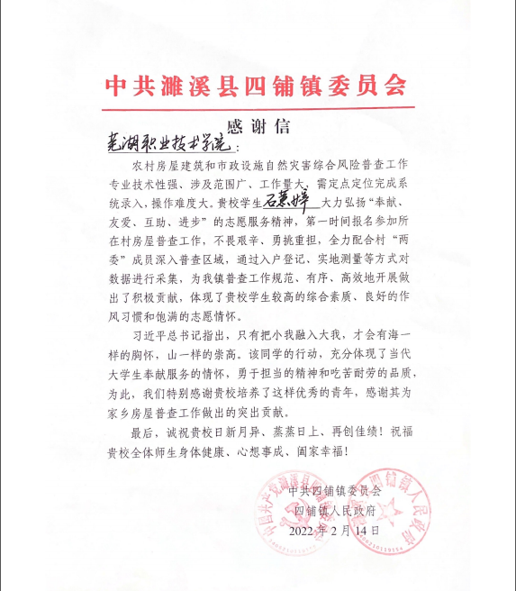 近日,公共管理学院收到一封来自四铺镇人民政府寄来的感谢信,信中对我院2021级人力资源管理专业1班学生石蕙婷主动参与四铺镇2022年农村房屋建筑和市政设施自然灾害综合风险普查工作表示感谢,并对她的突出表现给予高度肯定和赞扬。对我校在培养学生较高的综合素质、良好的作风习惯、饱满的志愿情怀以及勇于担当的精神和吃苦耐劳的品质等方面所做的教育工作表示感谢。