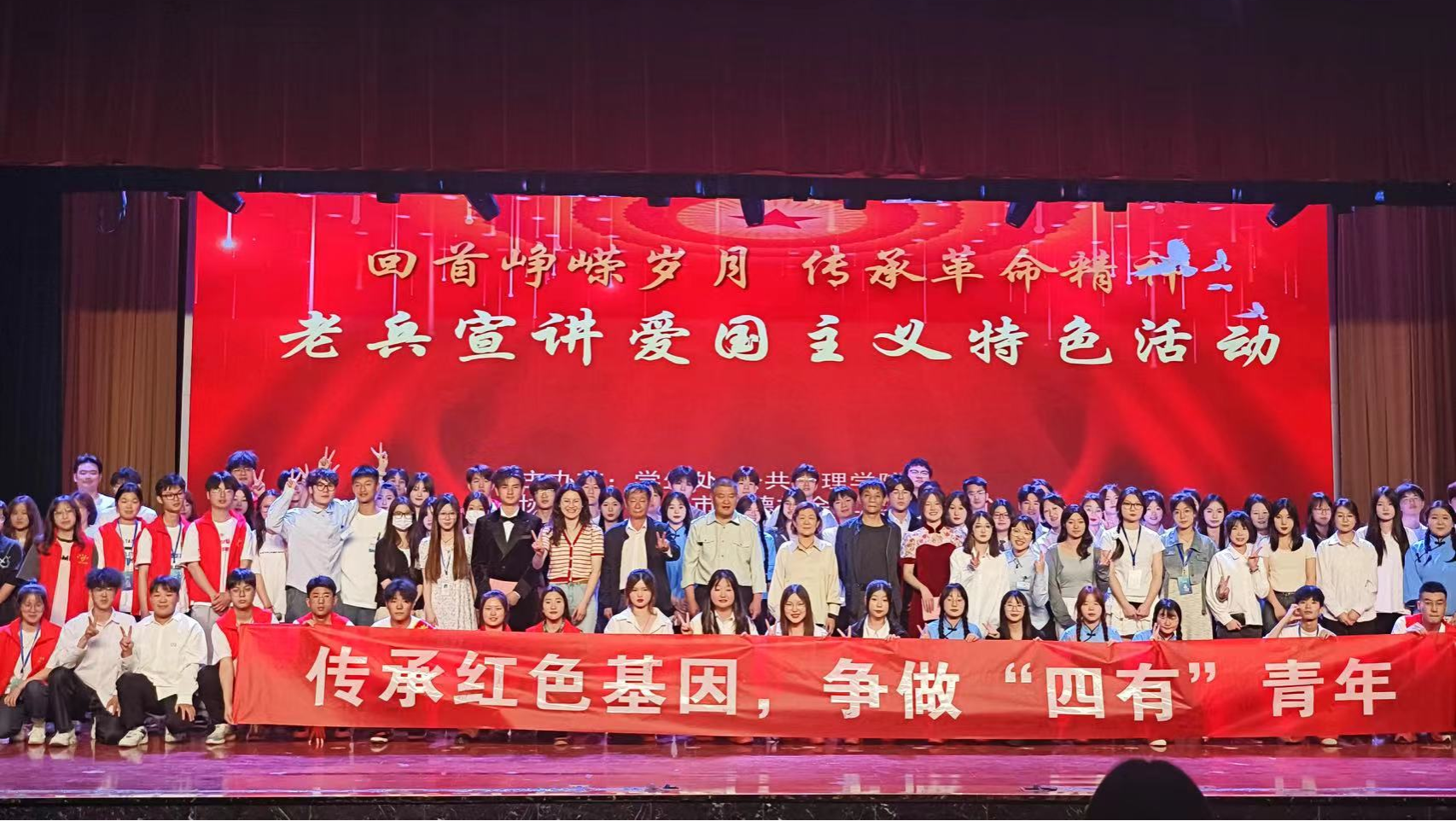 一代人有一代人的使命,一代人有一代人的担当,老兵宣讲结束后,学生们以文艺表演的形式表达对军人的敬仰之情和爱国之心。他们精心准备了朗诵《青春中国》、话剧《穿越时空》、合唱《国家》、舞蹈《有我》等精彩节目,我院学生代表谢雪激情澎湃地演讲《以楷模为镜,正自身衣冠》,赢得现场观众的阵阵掌声,将爱国情怀深深植入在场的每一位观众心中。活动最后,老兵们和现场的领导老师以及学生代表一起上台签名并合影留念。