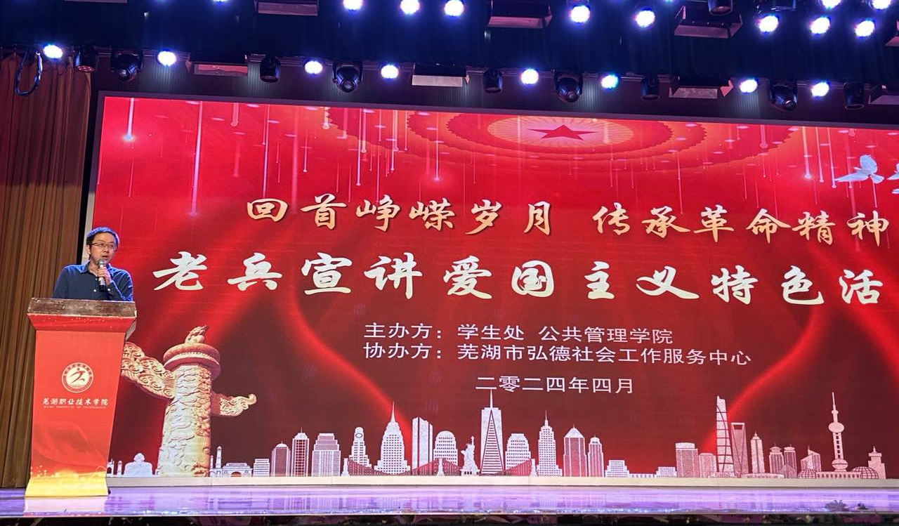 正值渡江战役胜利暨江城芜湖解放75周年之际,4月24日,在芜湖职业技术学院学生处大力支持下,公共管理学院举办了“回首峥嵘岁月 传承革命精神”第六届老兵宣讲爱国主义特色活动。本次活动在南校区大礼堂隆重举行,活动邀请了芜湖市宏德社会服务中心的5位退役老兵,学生处副处长牛志伟、公共管理学院党总支副书记王永琦、学工科长毕厚煌、团委书记张婉春以及学院五百余名学生出席了本次活动。