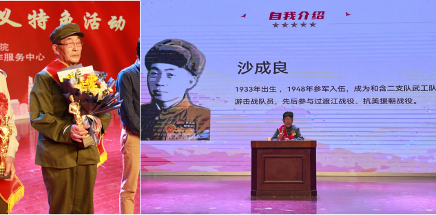 随后,退伍老兵沙成良上台宣讲。1949年4月24日,芜湖解放。当年亲历烽火岁月的沙成良老兵,今日已入耄耋之年,而那一段段鲜活的往事,透过历史的硝烟,依旧发出震撼人心的回响。“1948年,我参军加入和含二支队武工队,受伤后坚持参与渡江战役。1949年,物资匮乏时,老百姓协助我军渡江解放芜湖。新中国成立后,我入解放军步兵学校学习,后赴朝鲜战场保卫运输飞机和大桥。1951年修复大同江大桥碉堡线时,美军轰炸导致我失去知觉,两位战友牺牲。相比英勇的战友,我是幸运的,真正的英雄是他们。”以鲜活的历史对话青年人,沙成良老兵的讲述流露出对逝去战友的深深思念,深深打动了在场的同学们,不禁感叹今天来之不易的幸福生活,更加重视铭记革命历史、传承红色基因,将爱国之情、报国之志转化为实际行动,为实现中华民族伟大复兴的中国梦贡献青春力量。