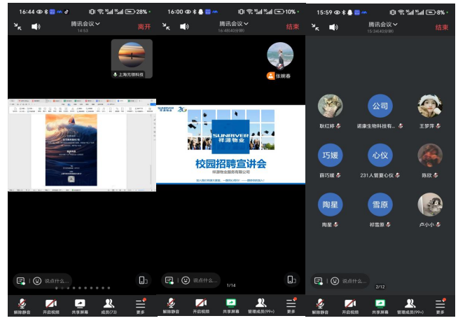 线上招聘会在腾讯会议室进行,安徽祥源物业服务有限公司、碧桂园服务集团股份有限公司、安徽智航人才服务集团有限公司、元领科技(上海)有限公司等各个优质企业依次进行线上宣讲,全方位展示了企业文化、工作环境、发展前景、岗位需求等。在企业工作的优秀校友,也现身说法,结合自身经历,分享了在企业的工作体验,为即将步入职场的学弟学妹们提供了宝贵的经验和建议。宣讲结束后,学生们积极提问,企业代表耐心解答,现场互动热烈。