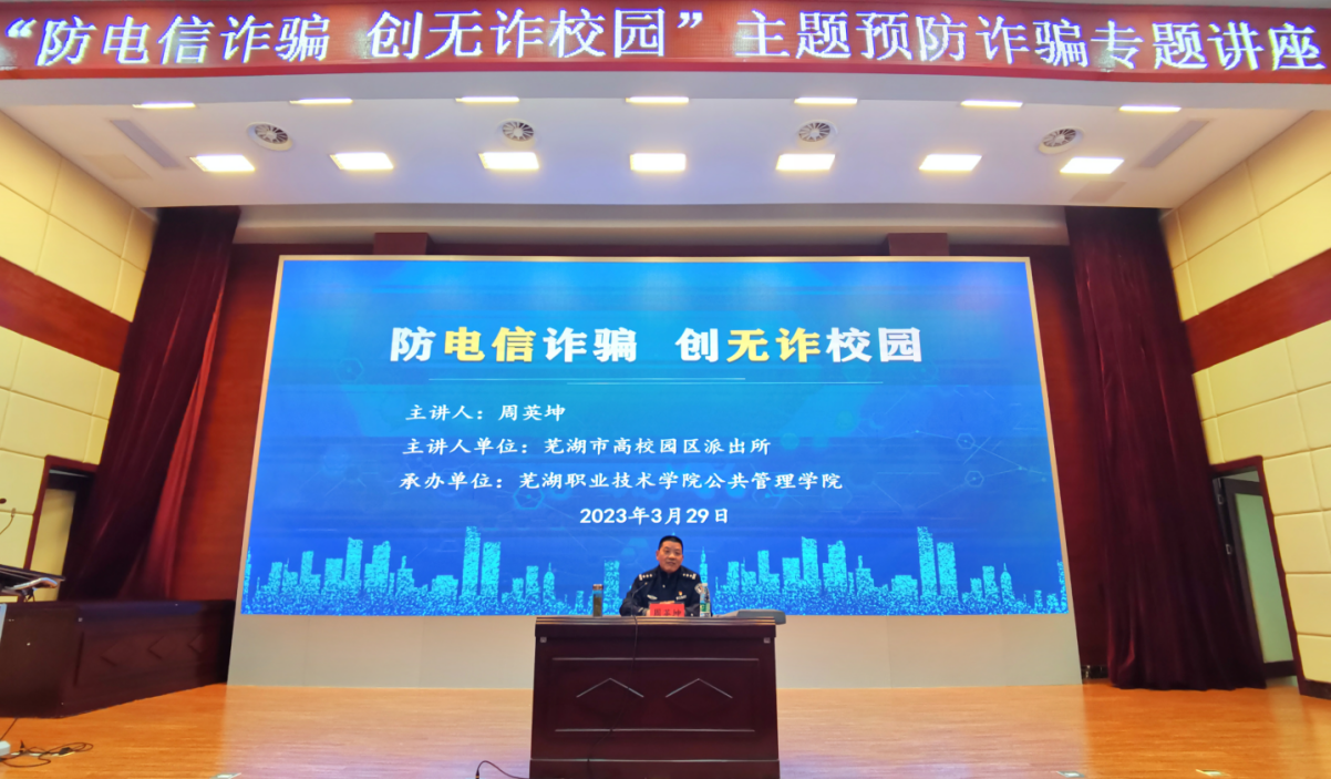 为切实增强广大师生的防诈骗意识和安全意识,提高自我保护能力,创建平安和谐校园,3月29日,公共管理学院开展《防电信诈骗 创无诈校园》预防诈骗专题讲座,本次讲座邀请到了高教园区派出所民警、芜湖市“五一劳动奖章”获得者、全省优秀社区民警周英坤作为主讲人。学院组织员兼学工科长毕厚煌、辅导员胡娟娟及22级全体学生参加讲座。