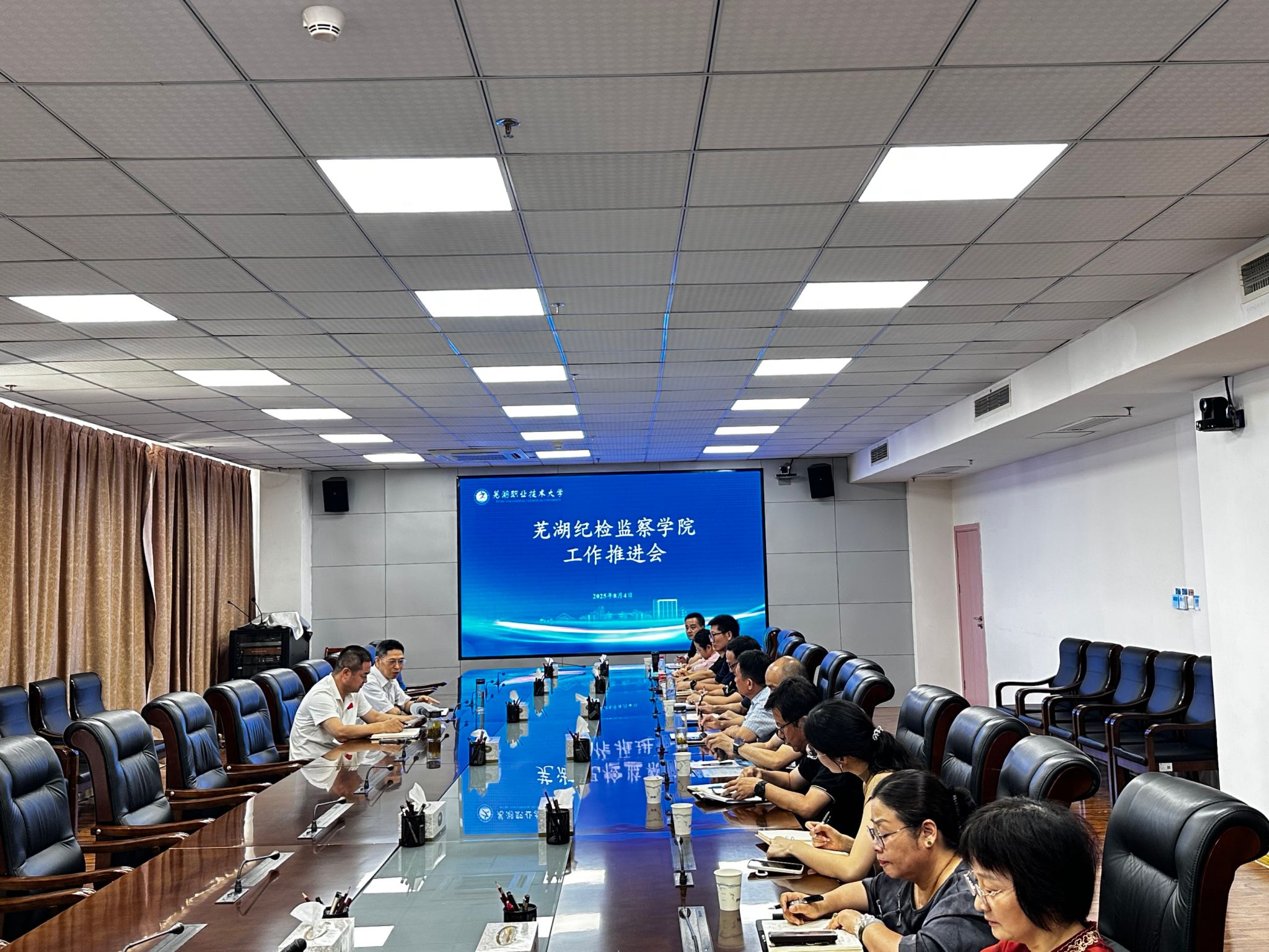 8月4日,学校召开芜湖纪检监察学院建设工作推进会。校党委委员、副院长季慕寅,校党委委员、纪委书记伍小平出席会议。校党委组织部、纪检监察审计处、人力资源处、教务处、科研处、财务处、招生就业处等部门负责人,以及公共管理学院党政领导班子成员参加会议。会议由伍小平主持。